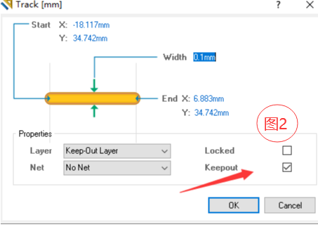 2.双击槽孔画线,打开线的属性,取消锁定。(图2 Keepout打勾取消)