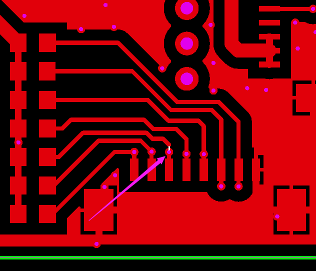 箭头处设计有误造成开路了,此开路被阻焊开窗挡住不易看到。